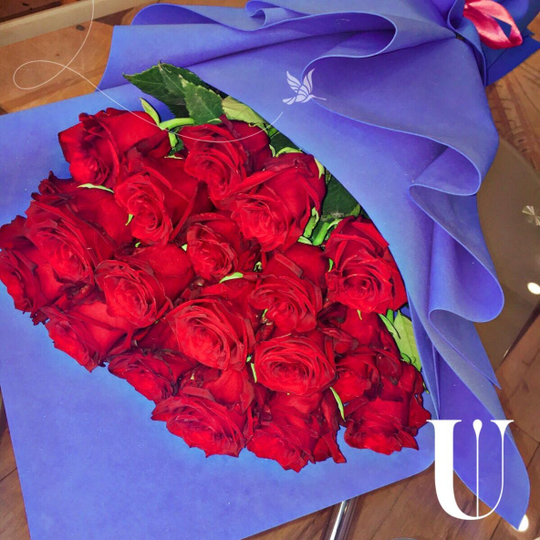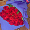 - Красная роза - 19 шт, упаковка дизайнерская - 3 шт, лента атласная - 2 шт