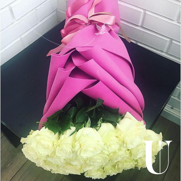 Белая роза - 25 шт, упаковка дизайнерская - 3 шт, лента атласная - 2 шт,