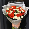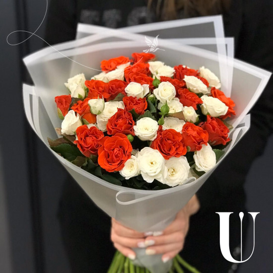 Роза кустовая - 19шт, Упаковка дизайнерская - 1шт, Лента атласная - 2шт