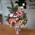 Цветочная композиция из белых и розовых роз, кустовых хризантем и розовых гвоздик в стильной упаковке