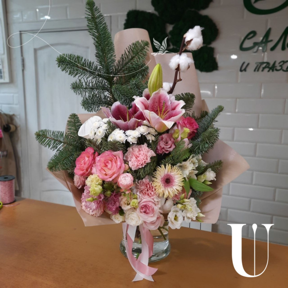 Гвоздика, гербера, лилия, нобилис, хлопок, хризантема сантини, эустома, роза, роза кустовая, альстромерия