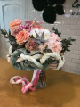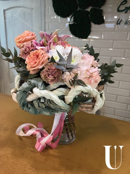 каркас ручной работы, гортензия, лилия, гвоздика, роза пионовидная, хризантема курстовая, эвкалипт,