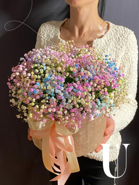 Композиция из белых кустовых хризантем, альстромерий и зеленого лагуруса в белой шляпной коробке