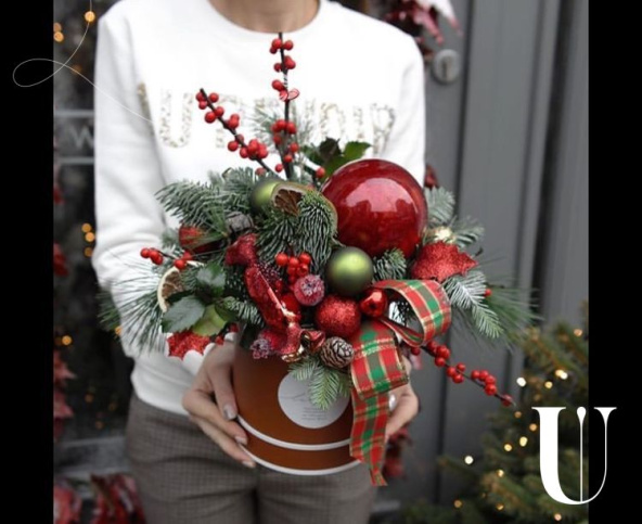 Ягоды - 2; Нобилис - 1; Хвоя - 1; Декор - 15; Флористическая губка - 1; Шляпная коробка - 1