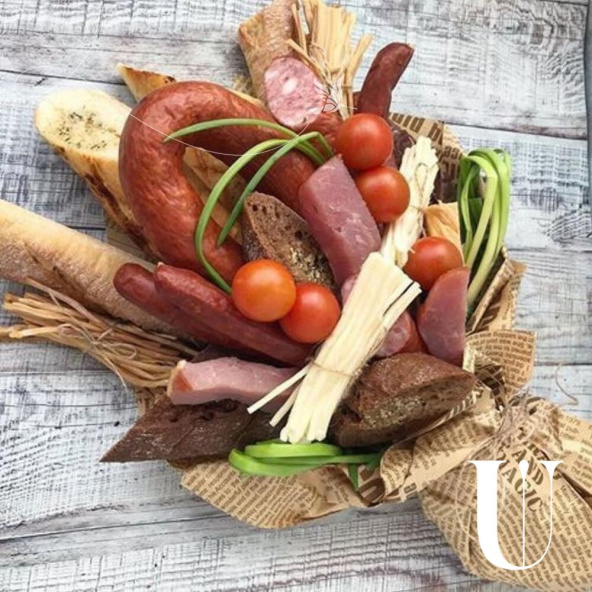- Лук перья - 50; Помидоры черри - 5; Колбаски - 3; Багет - 2; Сыр - 2; Колбаса - 1; Мясо деликатес - 1; Дизайнерская упаковка - 3; Лента атласная - 2