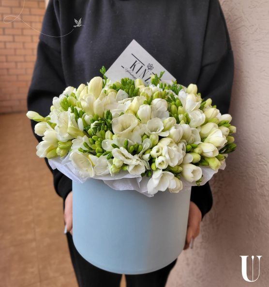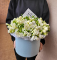 Большой букет из белых и голубых кустовых хризантем в упаковке