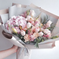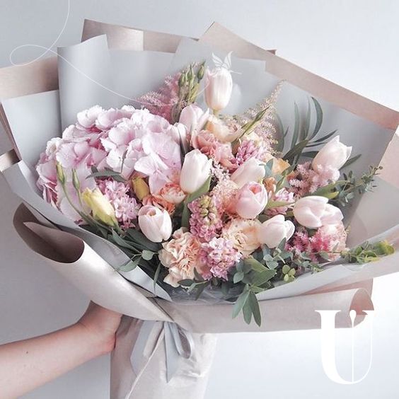 Гортензия 1шт., астильба 5 шт., тюльпаны 9 шт., гвоздика 5., эустома 7шт., гиацинт 3 шт., эвкалипт 4 шт., упаковка дизайнерская 4 шт