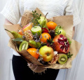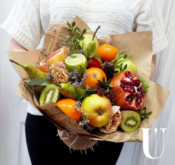 - Букет из настоящих фруктов и живых цветов. Все составляющие живут в составе букета около 6-10 дней