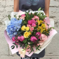 - Гортензия-1шт роза кустовая пионовидная мисти баблс-3шт роза кустовая пионовидная -5шт эустома-3 альстромерия-1 зелень упаковкаГортензия — уникальный цветок