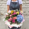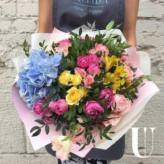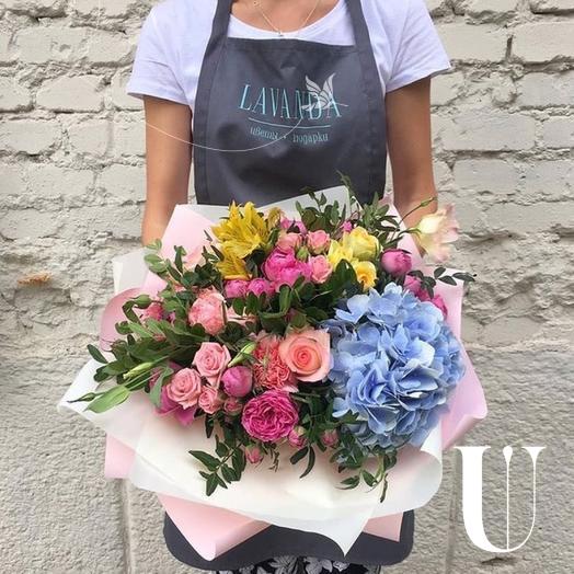 Роза кустовая пионовидная - 4 шт. роза кустовая - 3 шт. эустома - 3 шт. альстромерия - 2 шт. гортензия голубая - 1 шт