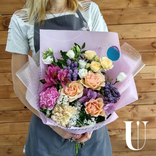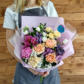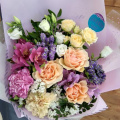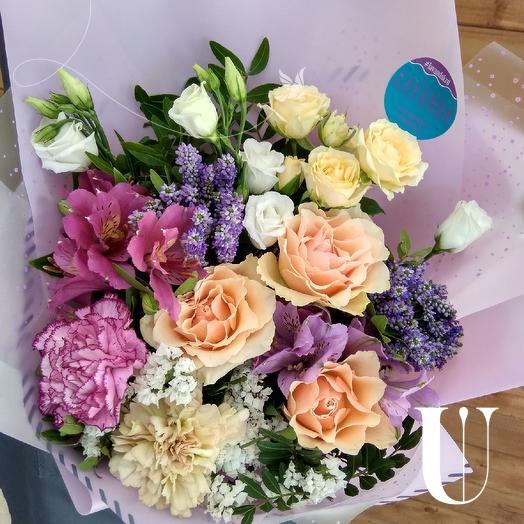 Роза - 3 шт. диантус - 2 шт. вероника - 2 шт. альстромерия - 2 шт. роза кустовая - 1 шт. эустома - 1 шт. статица - 1 шт
