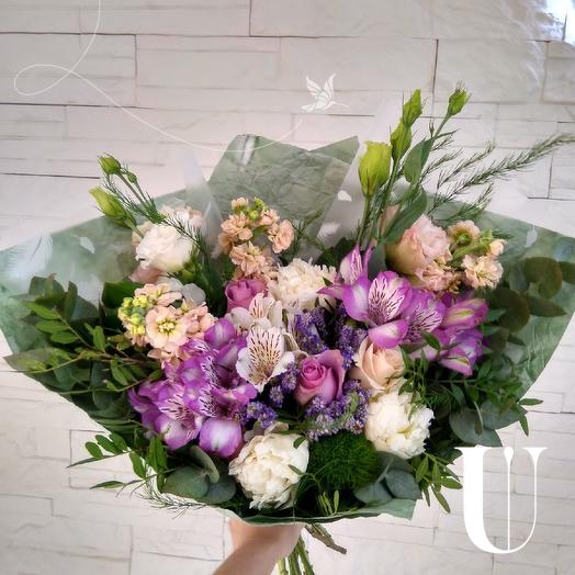 - Роза - 4 шт. пион - 3 шт. маттиола - 3 шт. эустома - 3 шт. альстромерия - 3 шт. вероника - 3 шт. упаковка - 1 шт