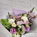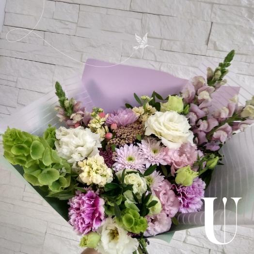 - Эустома - 4 шт. львиный зев - 3 шт. маттиола - 3 шт. диантус - 2 шт. хризантема кустовая - 2 шт. тысячелистник - 2 шт. упаковка - 1 шт. молюцелла - 1 шт. гиперикум - 1 шт