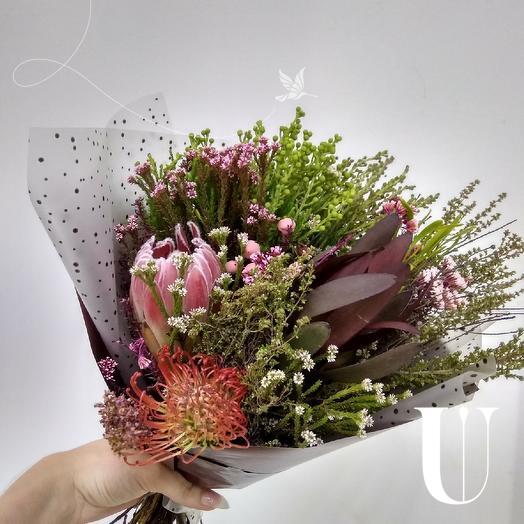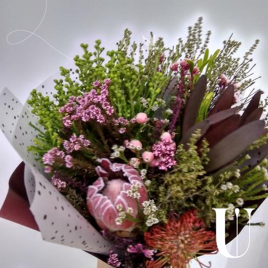 - Экзотика зелень - 10 шт. протея - 1 шт. леукоспермум - 1 шт. леукодкндрон - 1 шт. гиперикум - 1 шт. упаковка - 1 шт.Такой букет отлично подойдёт в виде неожиданного комплимента или станет незабываемым презентом на любое торжество! удивляйте любимых чаще!
