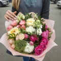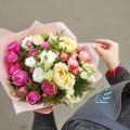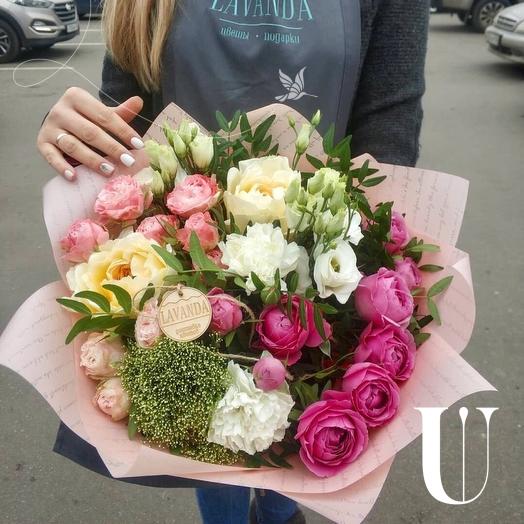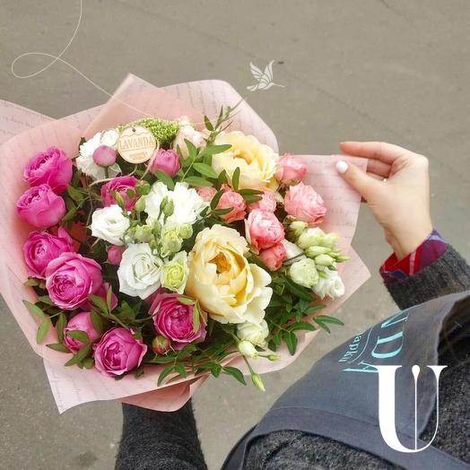- Роза кустовая пионовидная - 6 шт. эустома - 5 шт. трахелиум - 1 шт.Такой букет продемонстрирует ваш вкус и чувство стиля