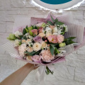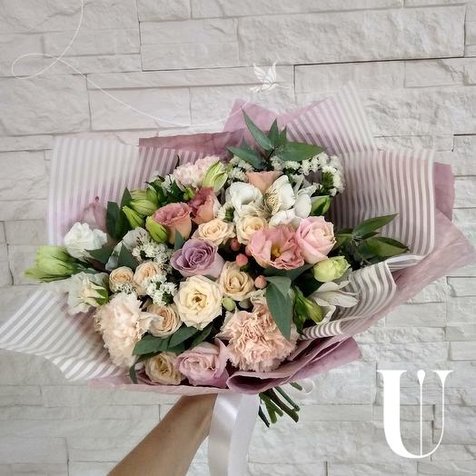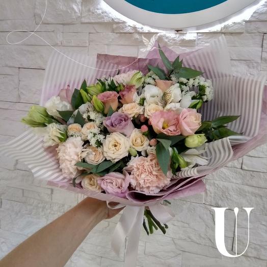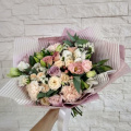 Альстромерия - 3 шт. эустома - 3 шт. диантус - 3 шт. роза кустовая - 3 шт. роза - 2 шт. статица - 1 шт. гиперикум - 1 шт. эвкалипт - 1 шт. упаковка дизайнерская - 1 шт