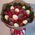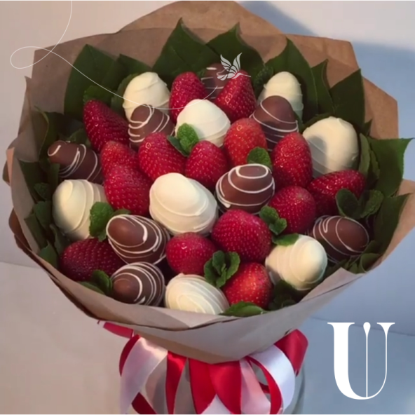 - Клубника в белом шоколаде - 8 шт, клубника в молочном шоколаде - 8 шт, клубника - 15 шт (общий вес клубники около 500 гр), мята - 1 пучок, зелень декоративная - 10 шт, упаковка крафт - 4 шт, лента атласная - 2 шт