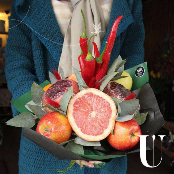 Экстравагантный высокий букет из фруктов и овощей