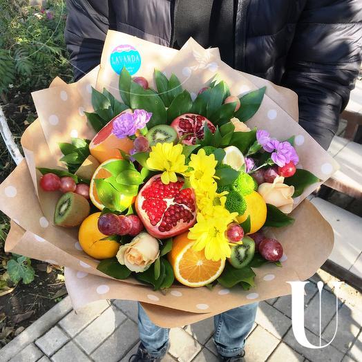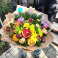 - Фрукт - 5 шт. роза - 3 шт. гвоздика - 2 шт. хризантема кустовая - 1 шт. сантини - 1 шт.Настоящий фейерверк из летних фруктов и свежайших цветов. такой подарок не только порадует получателя