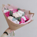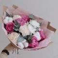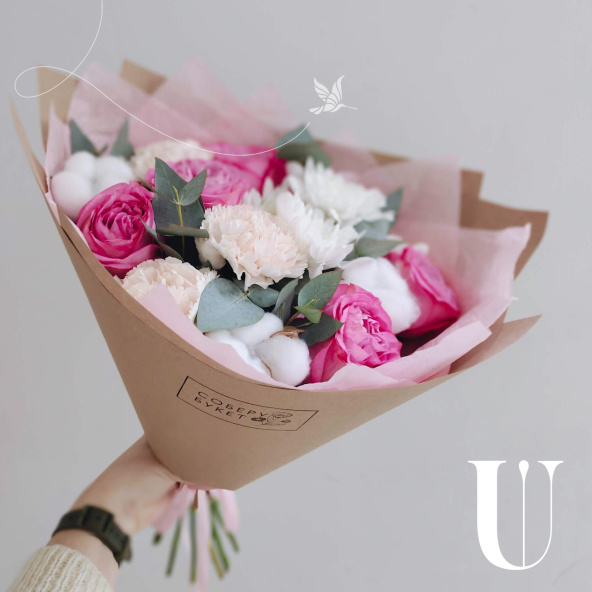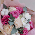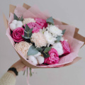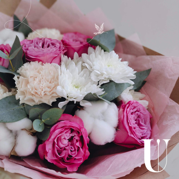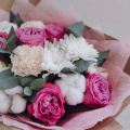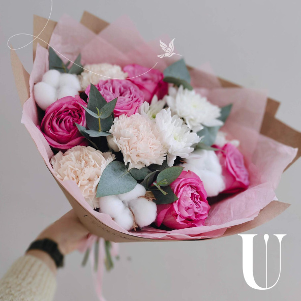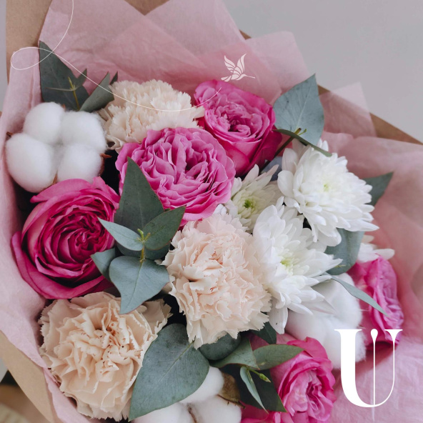 Нежный букет с пионовидными розами, гвоздиками, хризантемой и хлопком