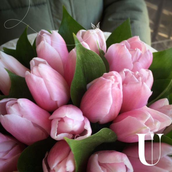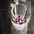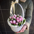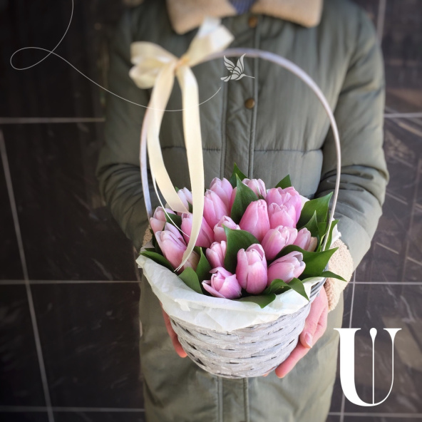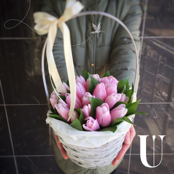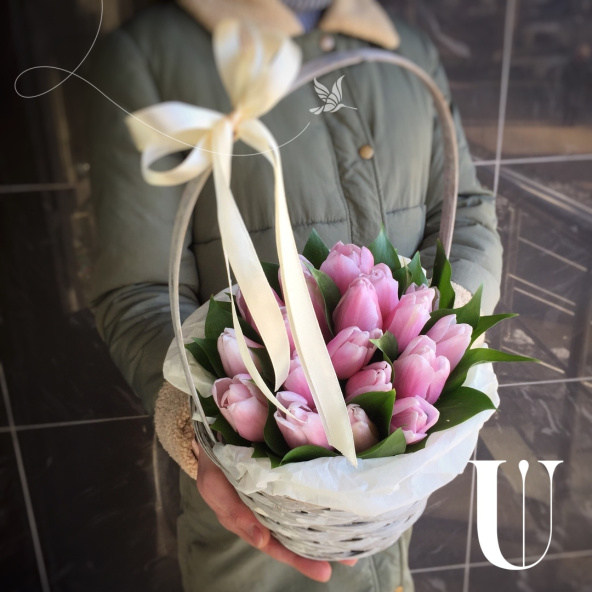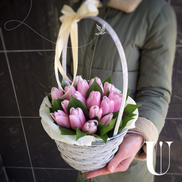 Тюльпан - 19, тишью - 2, флористическая губка - 1, корзина - 1