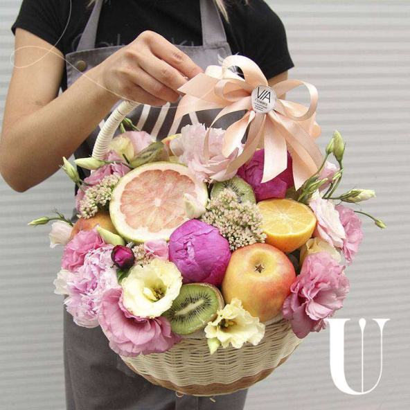 Нежная, но в тоже время яркая и насыщенная корзина с фруктами и цветами удивит и порадует любую девушку!
