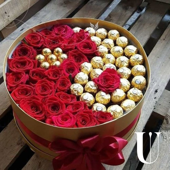 - Коробка 40 см, губка - 4 шт, ферреро роше - 32 шт, роза красная - 25 шт