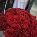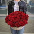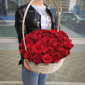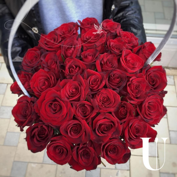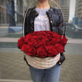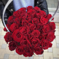 Композиция из белых кустовых хризантем, альстромерий и зеленого лагуруса в белой шляпной коробке