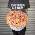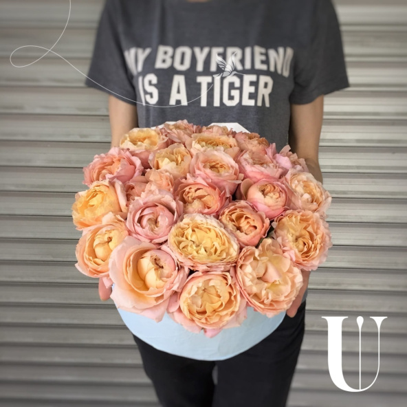 - Роза кустовая Джульетта - 7 шт. Губка флористическая - 1 шт. Шляпная коробка - 1 шт. Фантастические цветы и волшебные утонченные оттенки