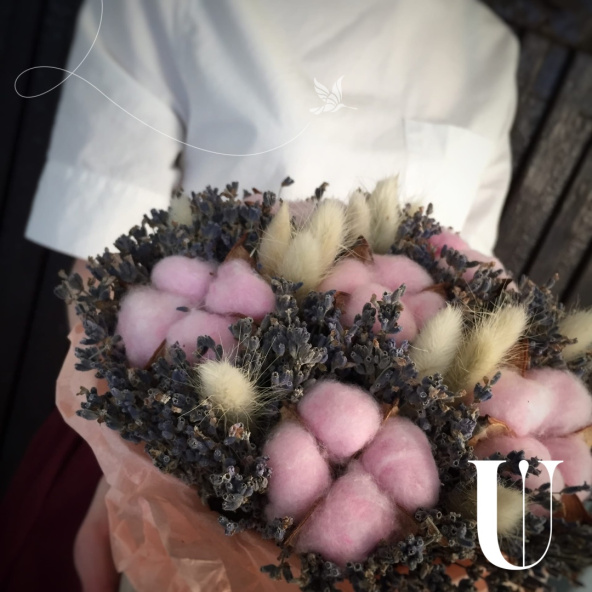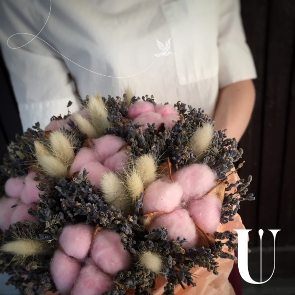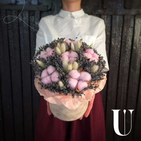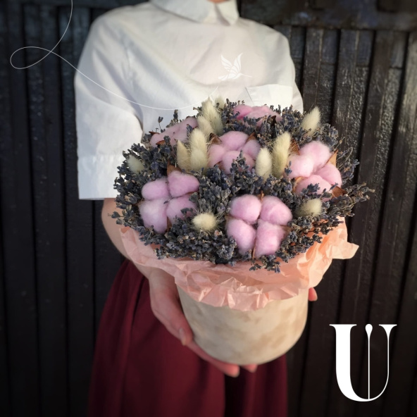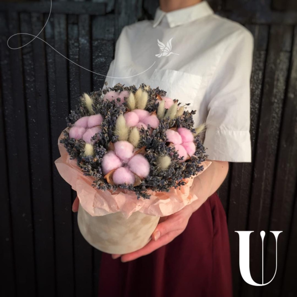Лагурус - 14 шт. хлопок - 6 шт. тишью - 2 шт. лаванда пучок - 1 шт. шляпная коробка - 1 шт. Фантастические цветы и волшебные утонченные оттенки, изысканность и легкость