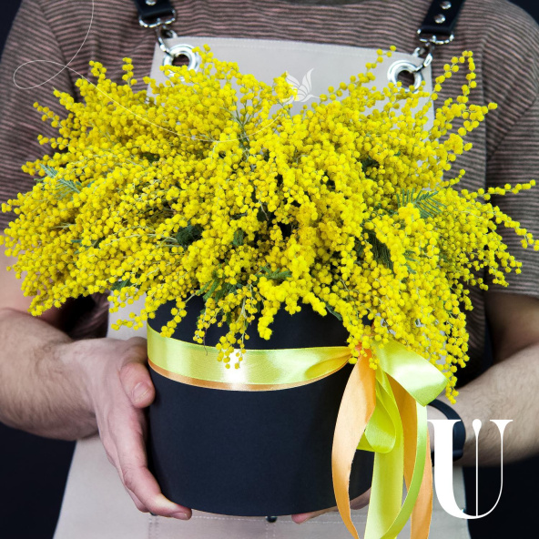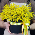 Композиция из белых кустовых хризантем в белой шляпной коробке
