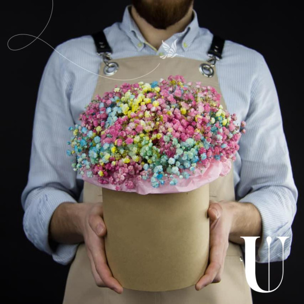 Мы предлагаем любителям нестандартных решений простую, но очень красивую цветочную композицию в виде шляпной коробки с пышными веточками цветной гипсофилы. Красиво, оригинально, и доступно по цене!