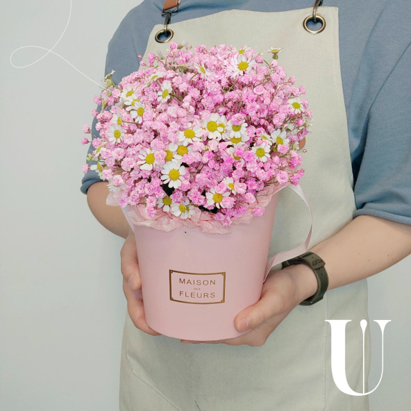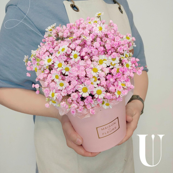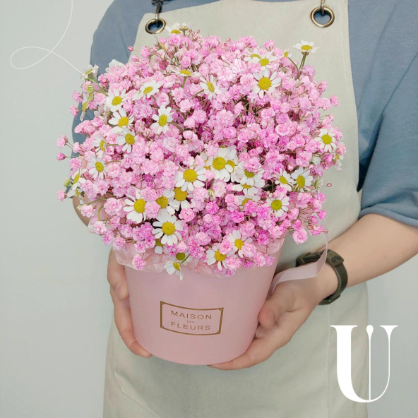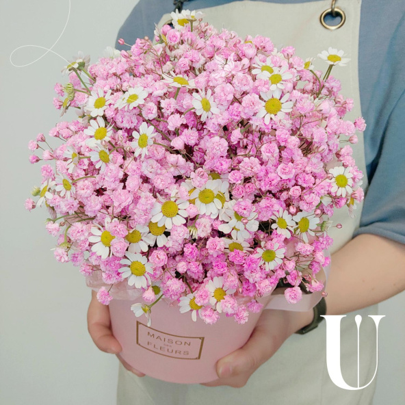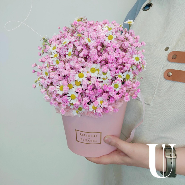 Нежный, воздушный, трогательный презент из розовой гипсофилы и полевой ромашки