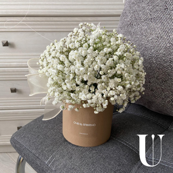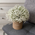 Композиция из белых кустовых хризантем в белой шляпной коробке