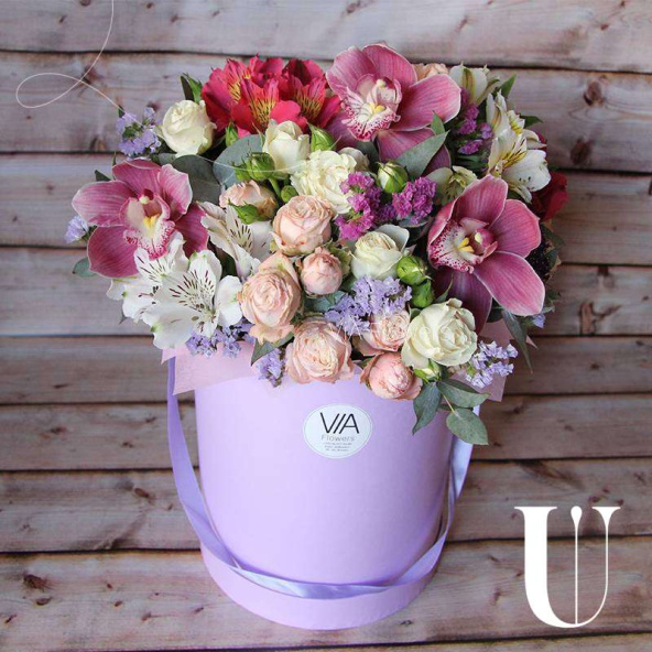 Орхидея, роза и альстромериея - беспроигрышное сочетание цветов, столь любых каждой девушкой. Здесь невозможно не угадать. Шляпная коробка в таком замечательном составе призвана остаться в памяти девушки навсегда! *Цвет коробки может быть выбран по усмотрению клиента!
