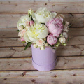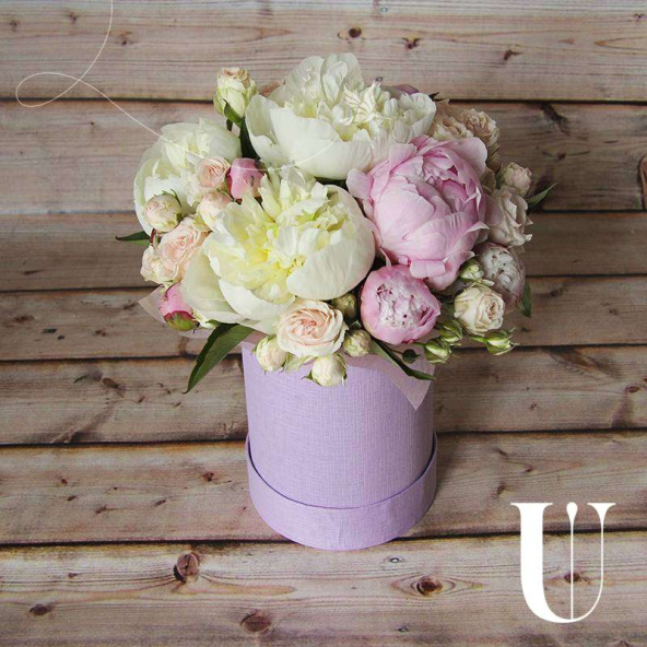 Цветы в коробке "Шляпная коробка с пионами и кустовой розой №66"