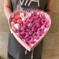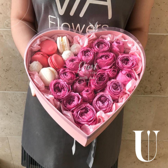 Нежное сердце с красивейшей пионовидной розой и вкуснейшими макаронсами,растопит сердце любой сладкоежке