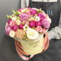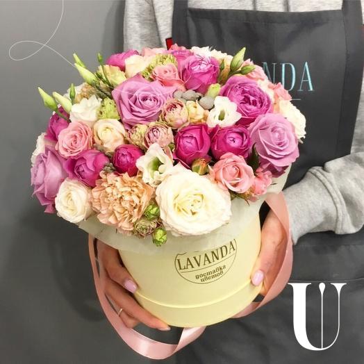 Кустовая пионовидная роза - 7 шт. кустовая роза - 7 шт. роза - 5 шт. эустома - 3 шт. диантус - 3 шт. коробка шляпная - 1 шт. пиафлор (оазис) - 1 шт. бруния - 1 шт