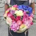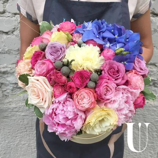 Пион - 3 шт. роза - 3 шт. питтоспорум - 3 шт. мисти баблс - 3 шт. бруния - 2 шт. эустома - 2 шт. бомбастик - 2 шт. гортензия - 1 шт. коробка шляпная - 1 шт