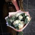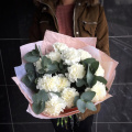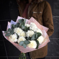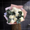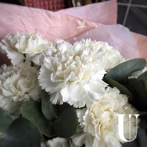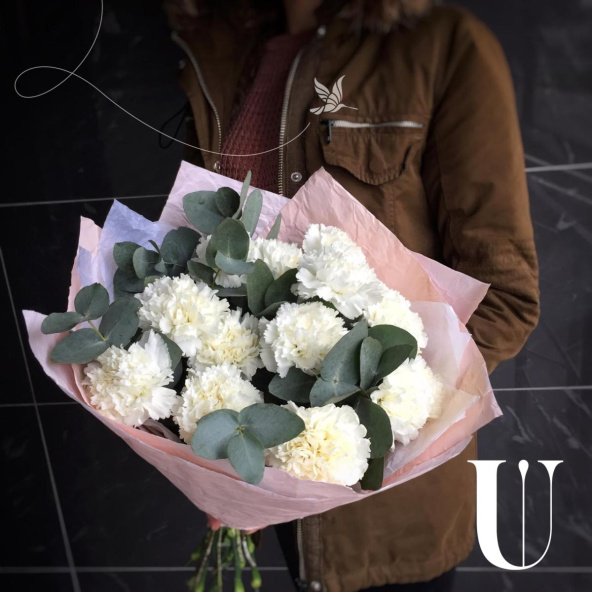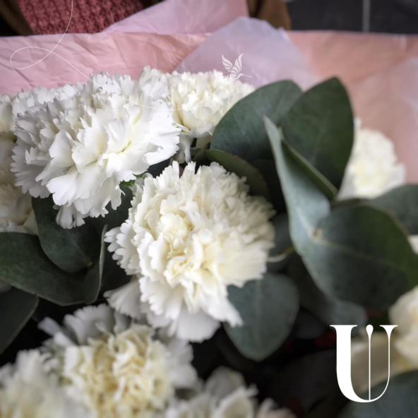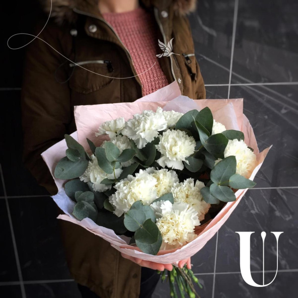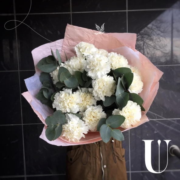 Диантус белый - 15 шт. эвкалипт - 10 шт. упаковка дизайнерская - 2 шт. лента атласная - 2 шт