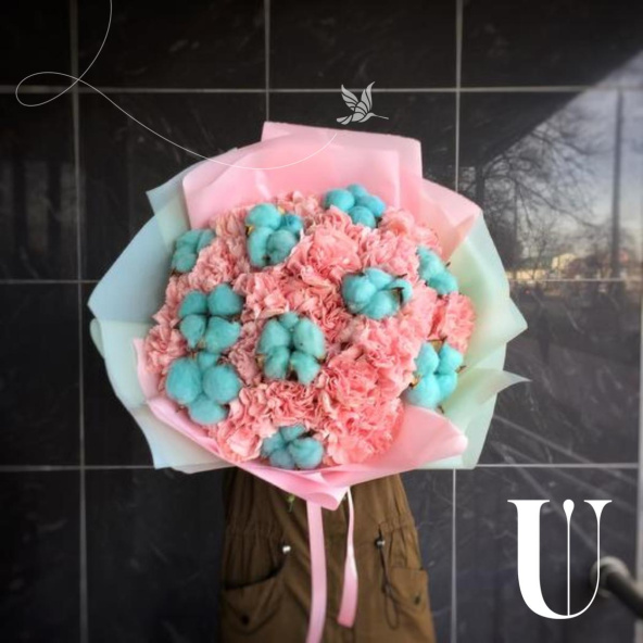Диантус - 19 шт. хлопок - 10 шт. упаковка дизайнерская - 2 шт. лента атласная - 2 шт