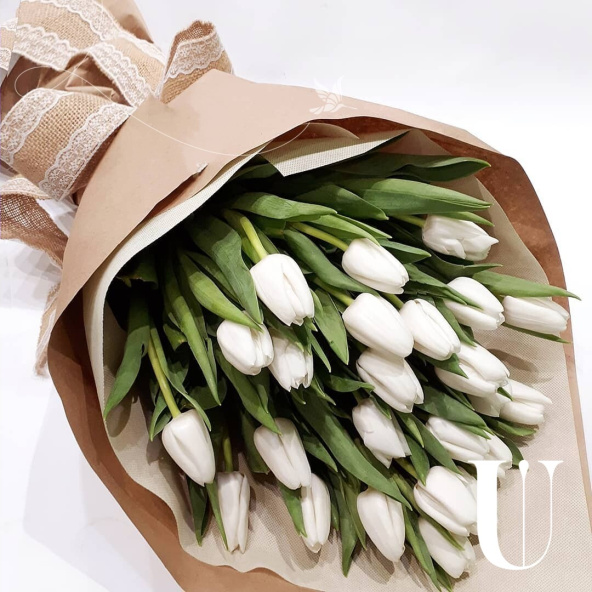 Нежность, трепет чувств, невинность и особый праздничный дух навевает этот красивый букет белых тюльпанов . Он состоит из 19 белоснежного тюльпана. На фоне зеленых листьев белые бутоны смотрятся особенно нежно и романтично. Такой букет лучше дарить юной красавице по любому поводу. Также эту композицию можно подарить на свадьбу, день рождения. Ваши близкие, родные и друзья будут в восторге от такого знака внимания