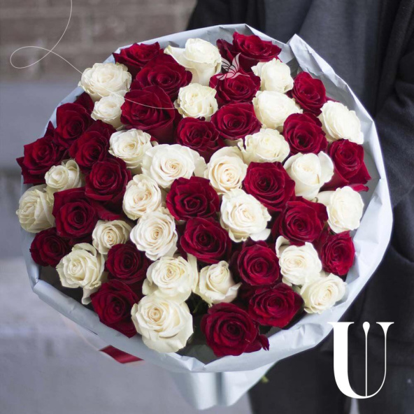 Роза микс - 51 шт., Упаковка дизайнерская - 2 шт., Лента атласная - 2 шт.