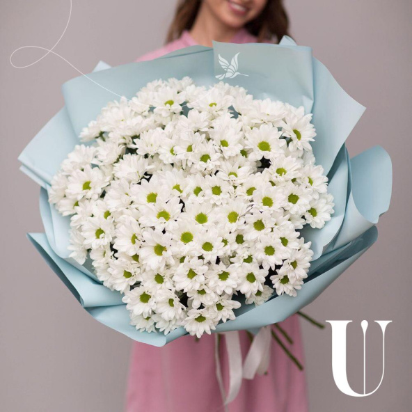 Хризантема кустовая - 15 шт., Упаковка дизайнерская - 2 шт., Лента - 2 шт.