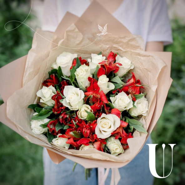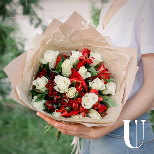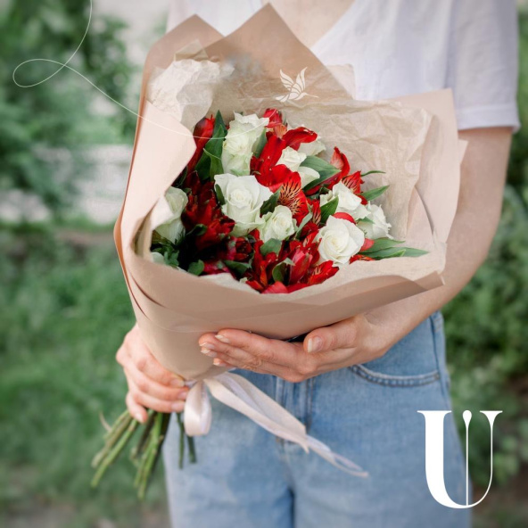 Роза белая 50 см - 15 шт., Альстромерия - 7 шт., Упаковка дизайнерская - 2 шт., Лента - 2 шт.