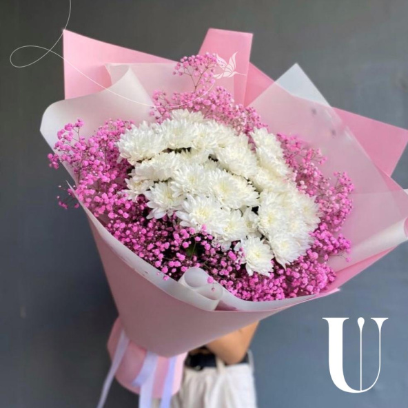Хризантема кустовая - 5 шт., Гипсофила - 9 шт., Упаковка дизайнерская - 2 шт., Лента атласная - 2 шт.