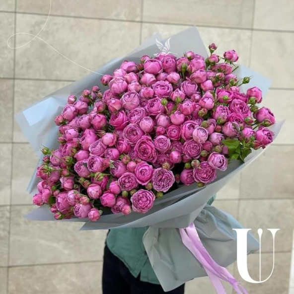 Роза кустовая пионовидная - 39 шт., Упаковка дизайнерская - 2 шт., Лента атласная - 2 шт.
