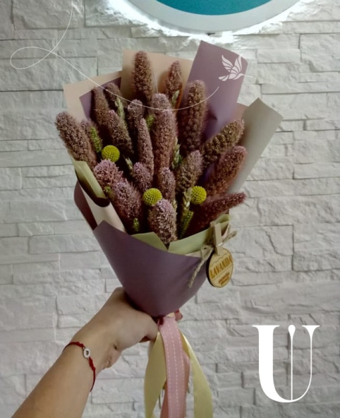 Нежнейшие пушистики с колосками и краспедией. интересная текстурность букета поразит своих счастливых обладателей и будет радовать долгие годы! букеты из сухоцветов не требуют ухода. отлично подойдут в качестве комплимента без повода или дополнения к презенту
