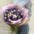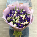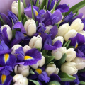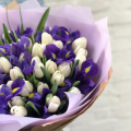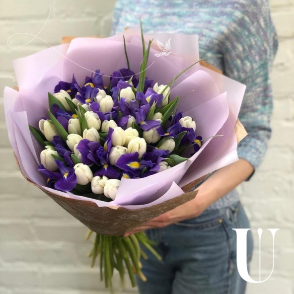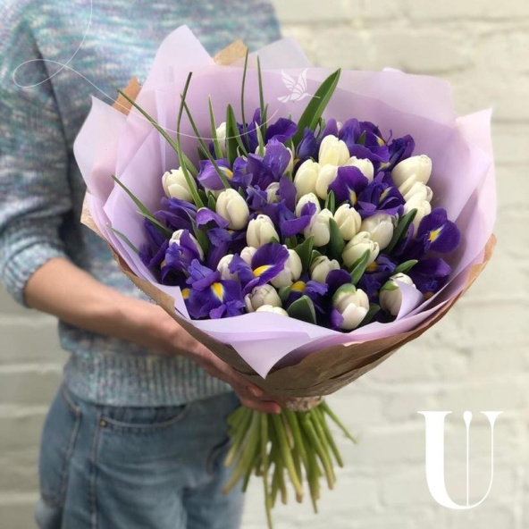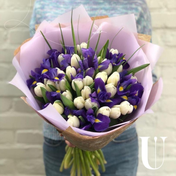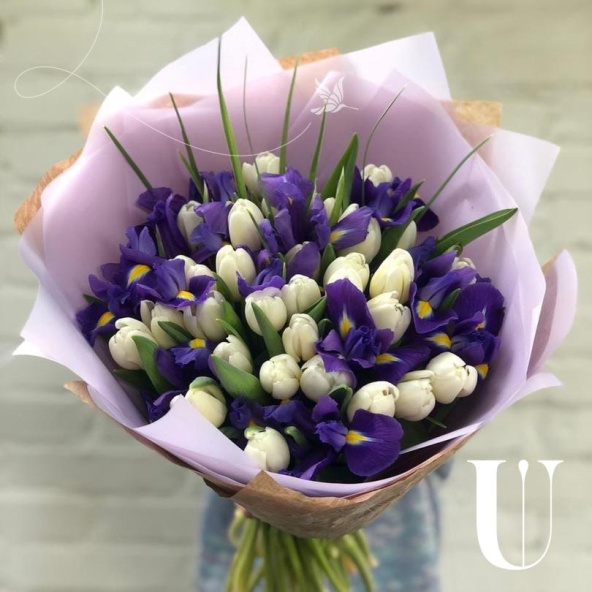 Тюльпан - 29, Ирис - 10, Упаковка дизайнерская - 2, Лента атласная - 2