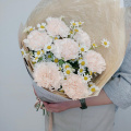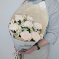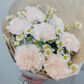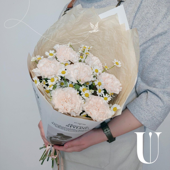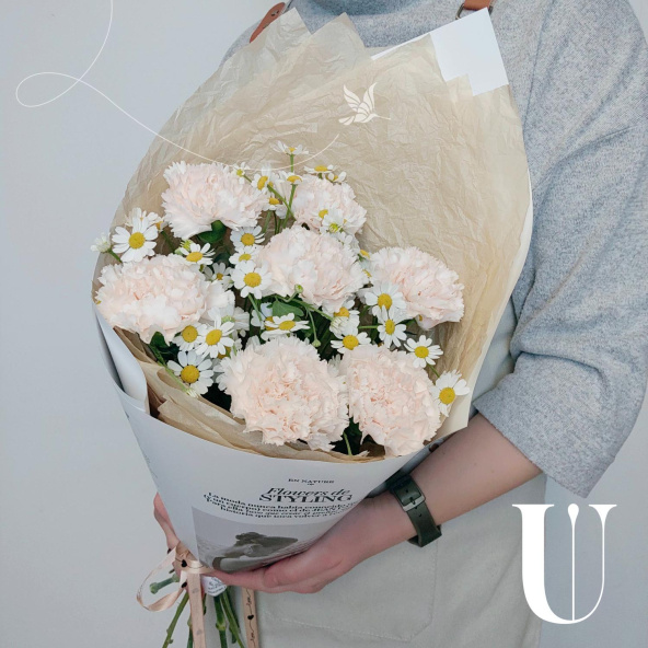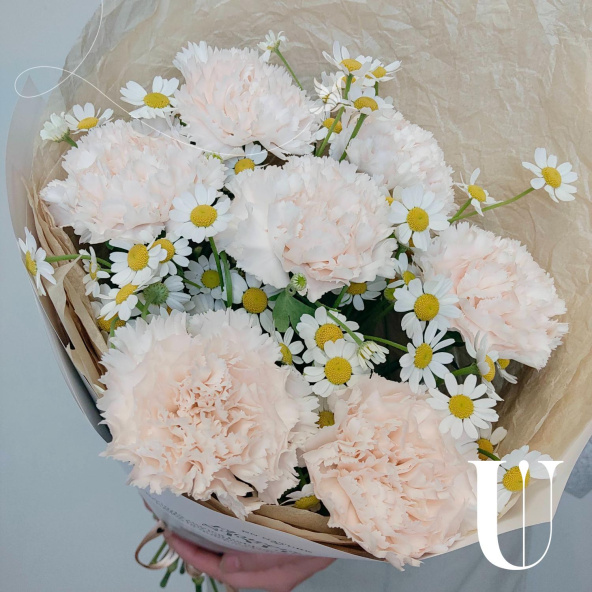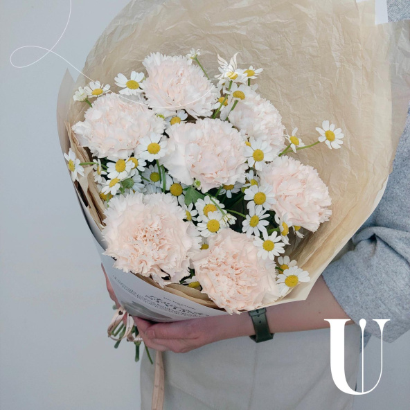 Нежное сочетание кремовых гвоздик и полевых ромашек